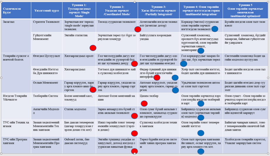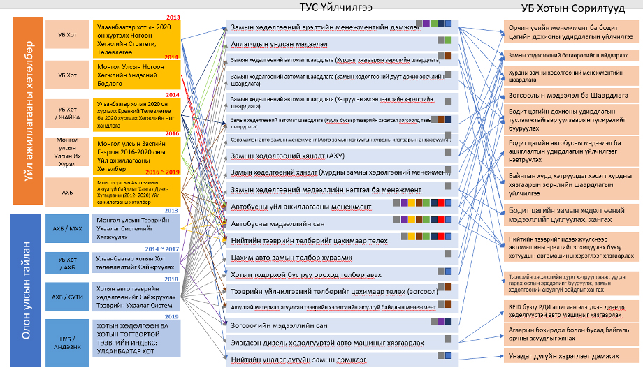 Тээврийн ухаалаг системийн сайжруулалтыг хурдацтай хөгжиж буй хотуудын ухаалаг хөдөлгөөний бодлого, аргазүй зэргээс жишээ татан хэрэгжүүлэх бөгөөд Улаанбаатар хот шиг хөгжиж буй бусад хотуудын туршиж үзсэн ухаалаг тээврийн системийн технологийн туршлагаас суралцан, хурдацтай хөгжлийн хэрэгцээнд тохирсон хамгийн сүүлийн үеийн технологийг нэвтрүүлнэ.