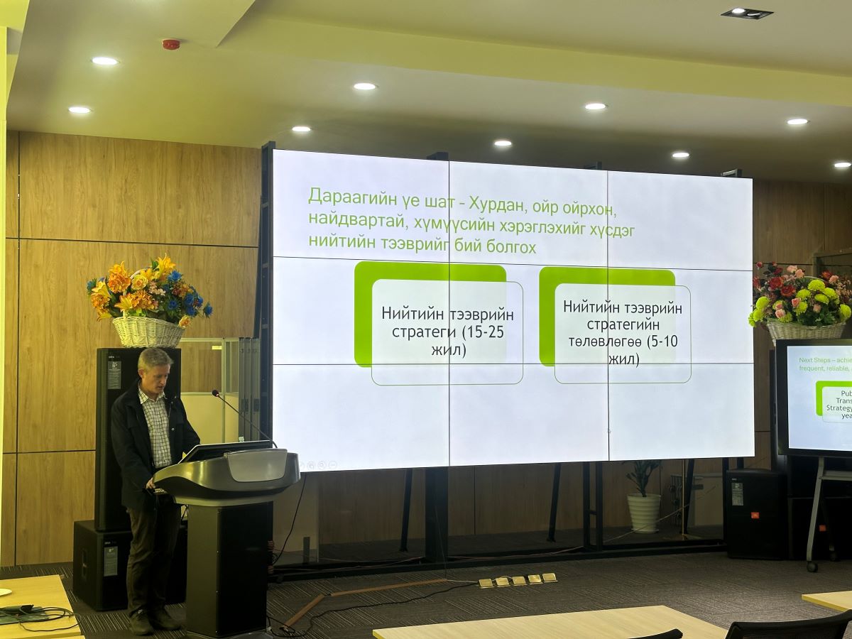 Улаанбаатар хотын тогтвортой авто зам, тээвэр төслийн хүрээнд хэрэгжүүлж буй “Нийтийн тээврийн стратеги боловсруулах зөвлөх үйлчилгээ”-ний хүрээнд зохион байгуулж буй чадавхи бэхжүүлэх ээлжит семинар 2024 оны 09 дүгээр сарын 25-ны өдөр “Улаанбаатар хотын нийтийн тээврийн үйлчилгээний өнөөгийн нөхцөл байдлын дүн шинжилгээний тайлан” сэдэвтэйгээр нийтийн тээврийн болон бусад холбогдох салбаруудын мэргэжилтэнүүдийн дунд амжилттай зохион байгуулагдлаа.