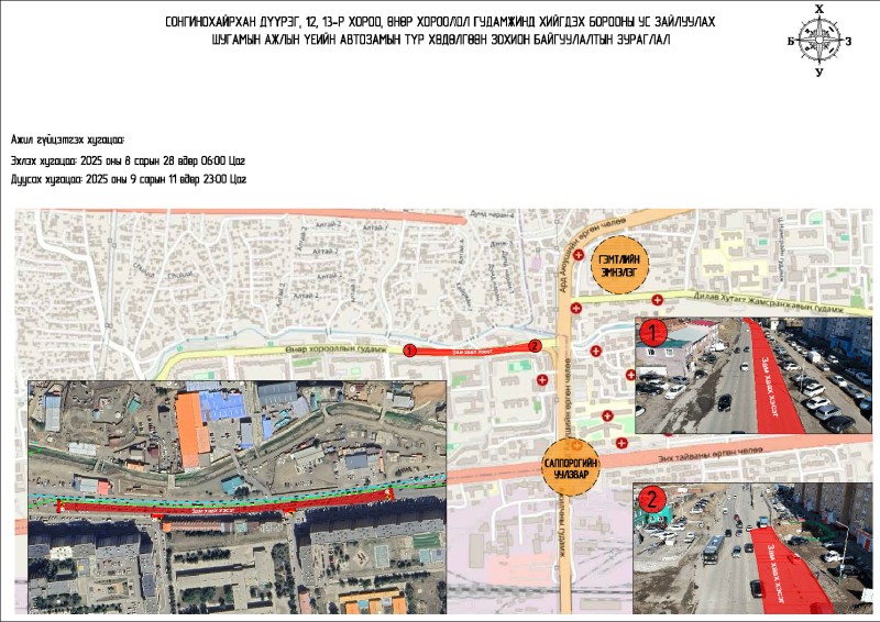 Drainage system installation for rainwater is currently underway on Unur Microdistrict Street, covering the 12th and 13th khoroos of Songinokhairkhan District. As a result, one direction of the road will be closed. Please refer to the temporary traffic arrangement in place.